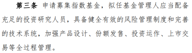 从产品注册环节来看,《指引》第三条、第四条分别对管理人专业胜任能力和指数质量作出要求。第三条要求拟任基金管理人应当配备充足的投资研究人员,具备健全有效的风险管理制度和完善的技术系统,加强产品设计、份额发售、投资运作、上市交易等全过程管理;第四条则规定申请募集指数基金,标的指数应当符合“成分券代表性强、分布广泛、流动性好、市场容量充足、指数运行平稳、编制方法客观透明可校验、可持续性有保障”等要求。